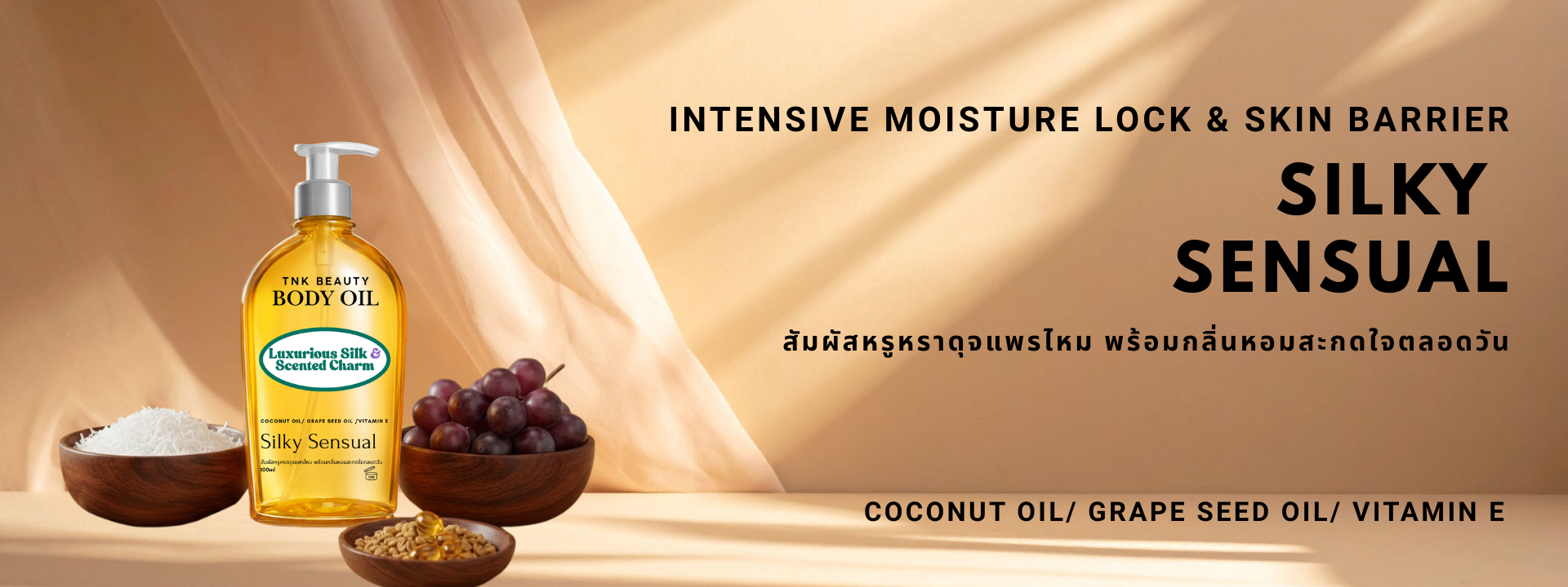 Body Oil สัมผัสหรูหรา ดุจแพรไหม (Silky Soft) มีกลิ่นหอมเย้ายวนติดทนนาน และใช้น้ำมันเมล็ดองุ่น (Grape Seed Oil)